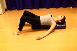①ストレッチポールに背骨と頭をのせ、仰向けになります。